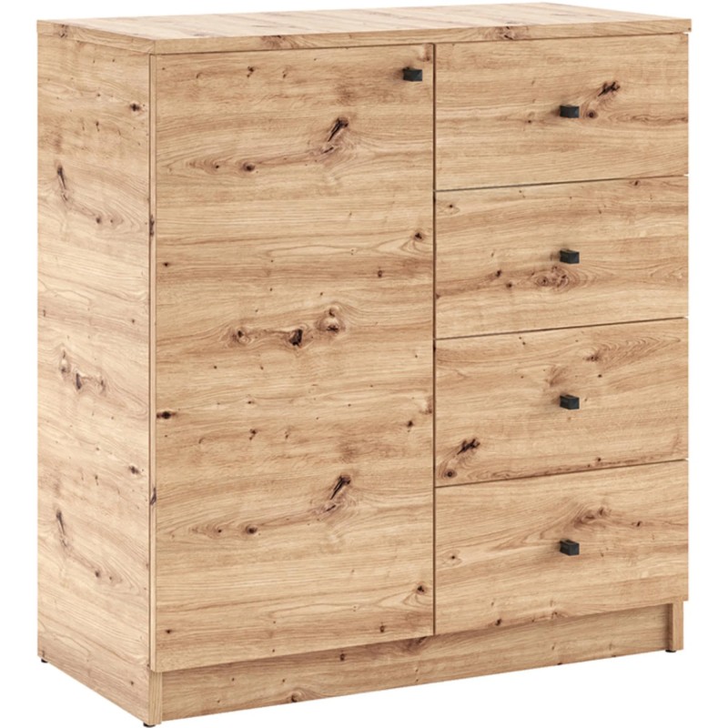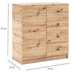 Komoda z Szufladami E1 to wyjątkowe połączenie nowoczesnego designu i tradycyjnego uroku drewna. Wykonana z wysokiej jakości panelu laminowanego o grubości 16 mm, w kolorze dębu artisan, dodaje ciepła i naturalnego klimatu każdemu pomieszczeniu. Czarne uchwyty wprowadzają kontrast i nadają meblowi nowoczesnego, eleganckiego charakteru.