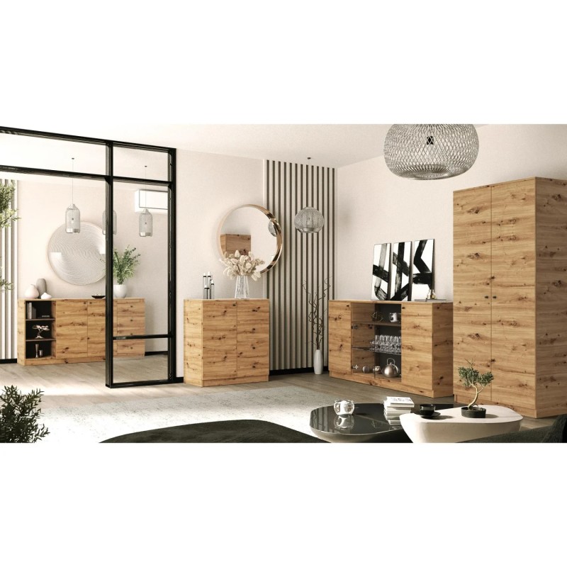 Komoda z Szufladami E1 to idealny wybór dla osób, które poszukują stylowego i praktycznego mebla do salonu lub sypialni. Ciepły odcień dębu artisan i nowoczesne czarne uchwyty wprowadzą do Twojego domu harmonię i elegancję.