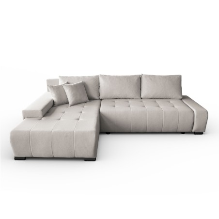 Ten nowoczesny narożnik do salonu został zaprojektowany z myślą o komforcie i praktyczności. Wyposażony w funkcję spania, szybko zmienia się w przestronne łóżko, co czyni go doskonałym wyborem do mniejszych mieszkań lub salonów gościnnych. Dodatkowy pojemnik na pościel umożliwia wygodne przechowywanie koców i poduszek, co pomaga utrzymać porządek w pomieszczeniu.