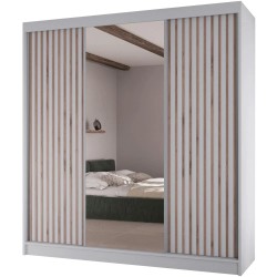 Szafa LICO II to mebel, który przyciąga wzrok dzięki oryginalnemu wykończeniu drzwi lamelami. To nie tylko estetyczny akcent, ale też modny element wnętrzarski, który nadaje przestrzeni charakteru i subtelnej lekkości. Trzy przesuwne drzwi, w tym jedno z dużym lustrem, optycznie powiększają pomieszczenie, wprowadzając do niego więcej światła i elegancji.