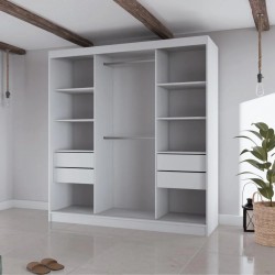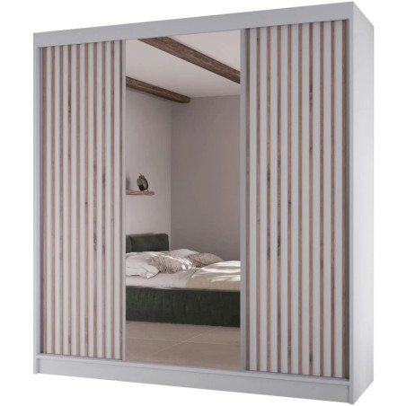 Praktyczna i stylowa szafa przesuwna z drzwiami przesuwnymi o szerokości 200 cm – idealny wybór do nowoczesnych sypialni i garderób! Dzięki zastosowaniu lustra na jednym z frontów, szafa optycznie powiększa przestrzeń, dodając wnętrzu lekkości i elegancji. Nowoczesne wzornictwo z dekoracyjnymi lamelami doskonale wpisuje się w aktualne trendy aranżacyjne, a funkcjonalne wnętrze z półkami, drążkiem i szufladami zapewnia wygodne przechowywanie ubrań i dodatków.