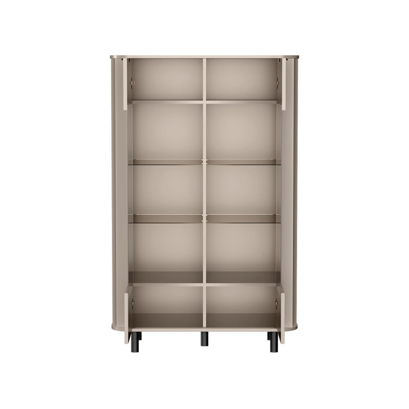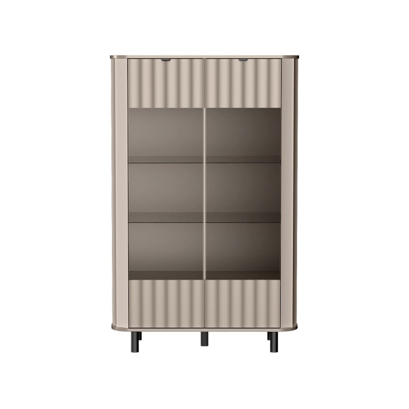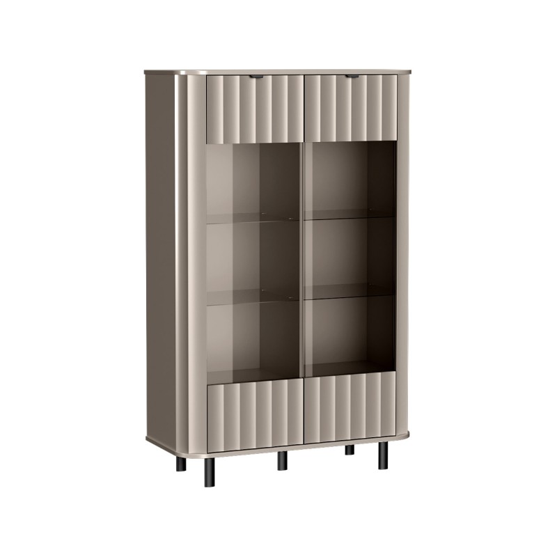 Witryna NEVADA to elegancki mebel z przeszkleniem, idealny do eksponowania dekoracji, książek i porcelany. Nowoczesny design z zaokrąglonymi krawędziami i szklanymi półkami doskonale uzupełni każde stylowe wnętrze.