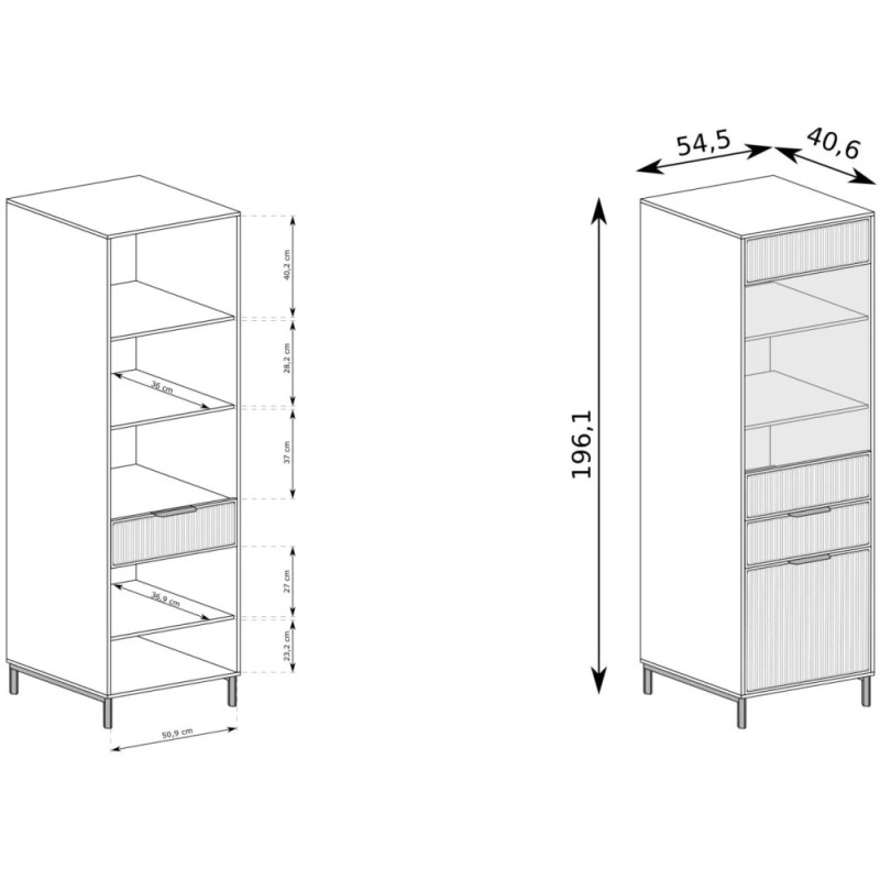 Charakterystycznym elementem witryny są ryflowane fronty wykonane z płyty MDF, które nadają całości wyjątkowego, designerskiego wyglądu. Górna część mebla składa się z dwóch otwartych półek umieszczonych za szklanym frontem – idealnych na książki, dekoracje, pamiątki czy eleganckie szkło. Dolna część witryny wyposażona jest w zamykaną szafkę z półką, która pomieści dokumenty, naczynia lub inne niezbędne akcesoria. Pomiędzy nimi znajduje się pojemna szuflada na drobiazgi, sztućce lub tekstylia.