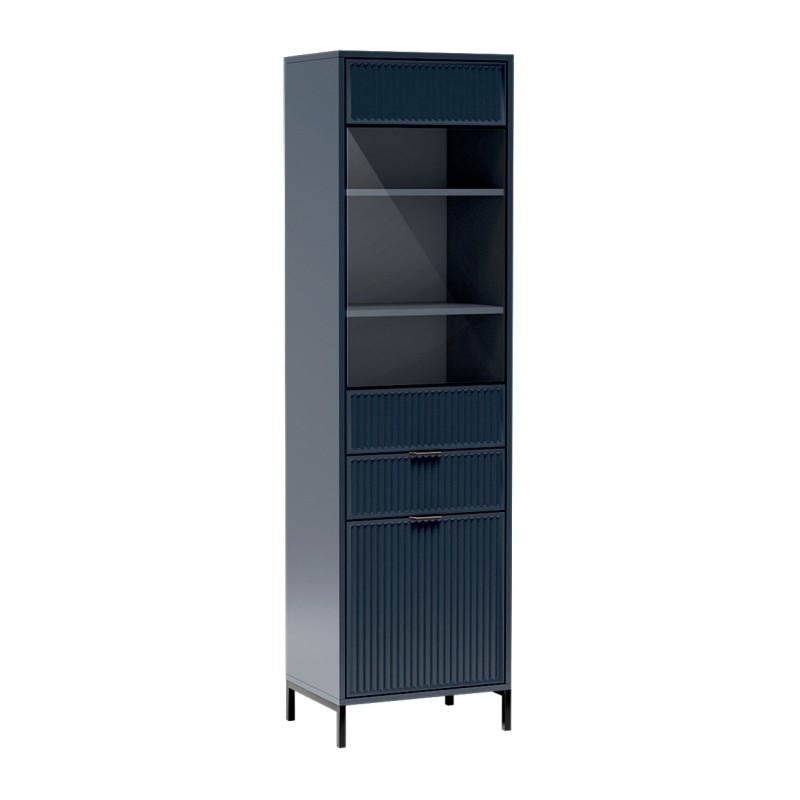 Witryna Linna to smukły, nowoczesny mebel z ryflowanym frontem i przeszkleniem, idealny do salonu, jadalni czy biura. Posiada otwarte półki za szkłem, szufladę i zamykaną szafkę. Wykonana z trwałych materiałów, osadzona na metalowych nogach, z systemem push-to-open i cichym domykiem. Dostępna w trzech kolorach: cashmere, indigo i green stone.