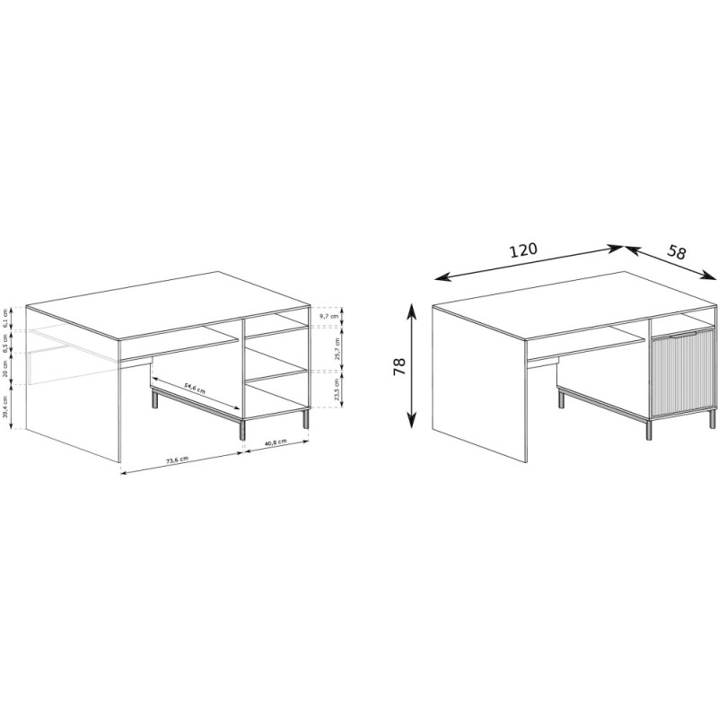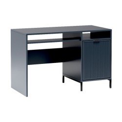 Biurko wyposażone jest w wysuwaną półkę na klawiaturę, która ułatwia organizację stanowiska komputerowego. Po prawej stronie znajduje się pojemna szafka z półką, dzielącą przestrzeń na dwa poziomy – idealna do przechowywania dokumentów, zeszytów lub akcesoriów biurowych. Ryflowany front dodaje meblowi elegancji i spójności z kolekcją.