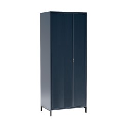Szafa Linna to pojemny i elegancki mebel z ryflowanymi frontami, wyposażony w półki i drążek na ubrania. Stoi na czarnych, metalowych nogach, co nadaje jej lekkości i umożliwia łatwe sprzątanie. Zawiasy z cichym domykiem zapewniają wygodę użytkowania. Dostępna w trzech kolorach: cashmere, indigo i green stone. Idealna do sypialni, salonu lub przedpokoju.