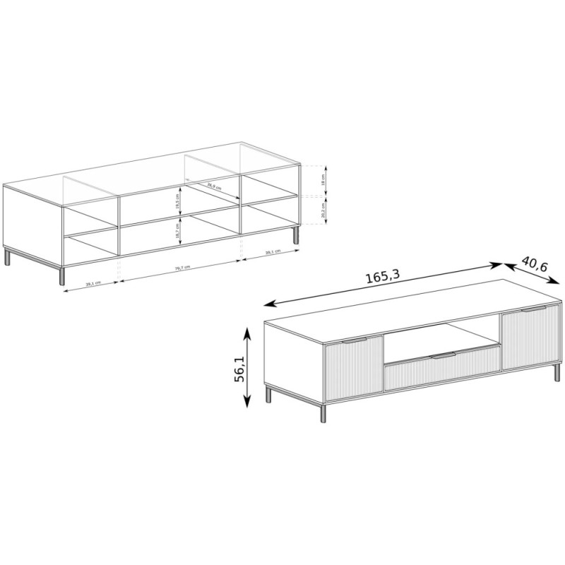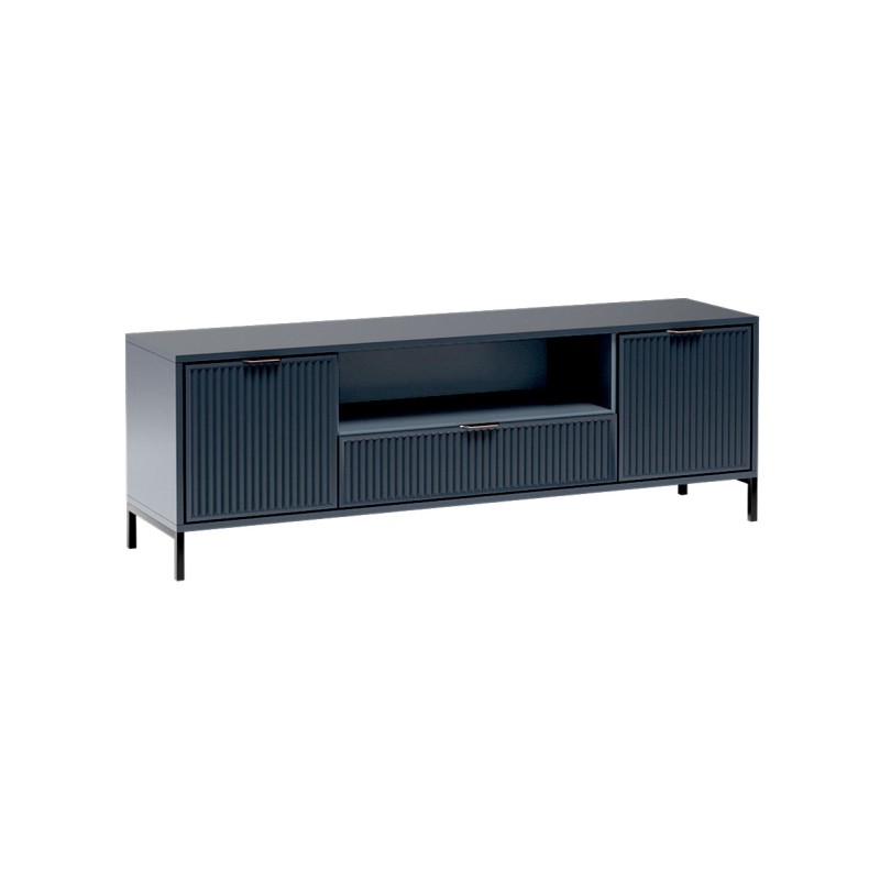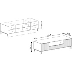 Centralna część mebla została wyposażona w otwartą półkę – idealną na dekoder, konsolę lub inny sprzęt RTV. Tuż pod nią znajduje się pojemna szuflada na drobne akcesoria. Po bokach umieszczono dwie zamykane szafki, które pomieszczą dodatkowe przedmioty i pozwolą utrzymać porządek w przestrzeni wypoczynkowej.