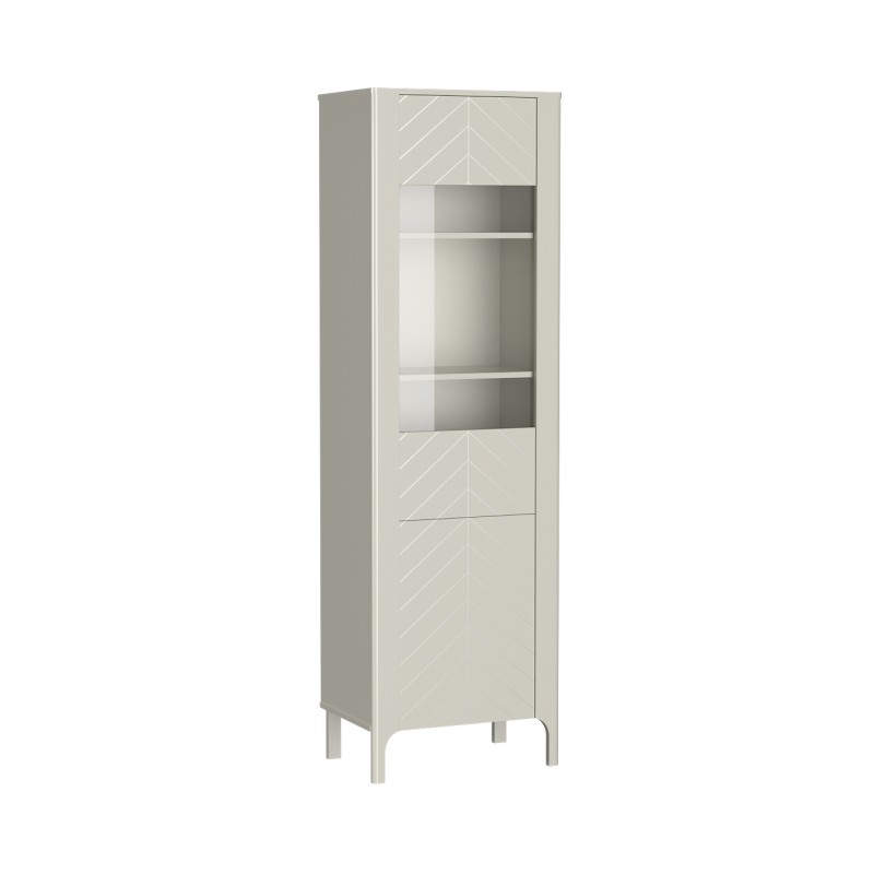 Witryna Lume to wysoki regał z przeszklonym frontem i półkami, który łączy stylowy wzór jodełki z praktycznym przechowywaniem. Dostępna w dwóch kolorach, idealnie wpasuje się w nowoczesne wnętrza, oferując elegancką ekspozycję ulubionych przedmiotów.