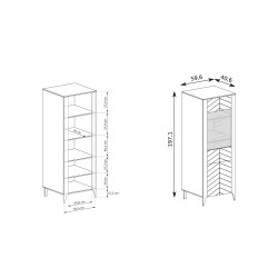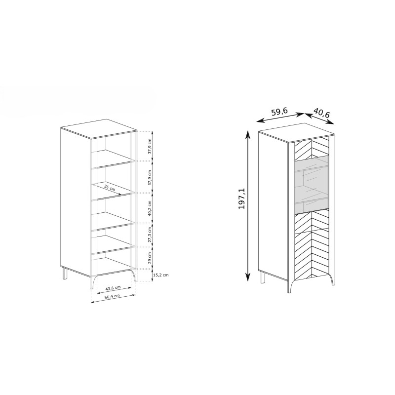 Witryna ma prawie 2 metry wysokości (197,1 cm), co pozwala wykorzystać nawet wysokie ściany bez przytłaczania wnętrza. Szerokość 59,6 cm i głębokość 40,6 cm sprawiają, że mebel świetnie sprawdzi się nawet w mniejszych lub wąskich pomieszczeniach, łatwo mieszcząc się w każdej wnęce.