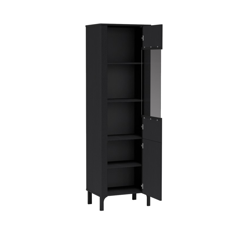 Za szklanym frontem znajdziesz cztery pojemne półki — doskonałe na porcelanę, książki czy dekoracje. W dolnej, zamkniętej części łatwo ukryjesz przedmioty, które chcesz mieć pod ręką, ale poza zasięgiem wzroku.