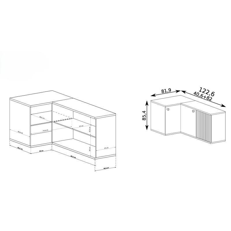 Komoda została zaprojektowana z myślą o maksymalnym wykorzystaniu przestrzeni. Jej narożna forma pozwala na ustawienie mebla tam, gdzie standardowe modele się nie sprawdzają. Wnętrze komody skrywa dwie praktyczne półki – idealne na dokumenty, tekstylia, dekoracje czy domowe drobiazgi.