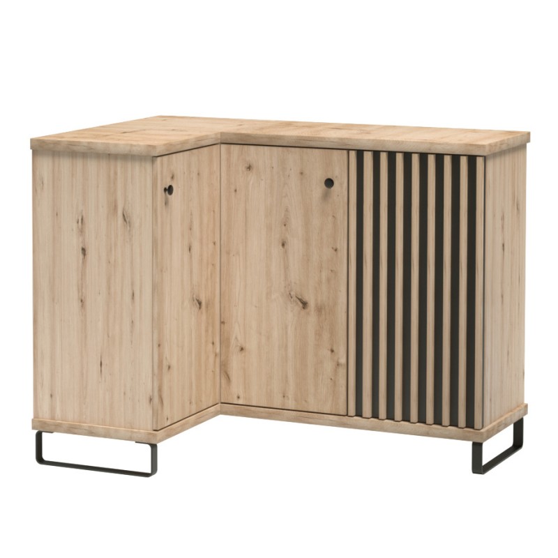 Nowoczesna komoda narożna z lamelami to stylowe i funkcjonalne rozwiązanie do zagospodarowania przestrzeni w rogu pomieszczenia. Praktyczne półki, modne wykończenie oraz opcja metalowych nóg czynią ją idealnym wyborem do nowoczesnych i industrialnych wnętrz.