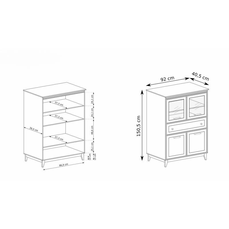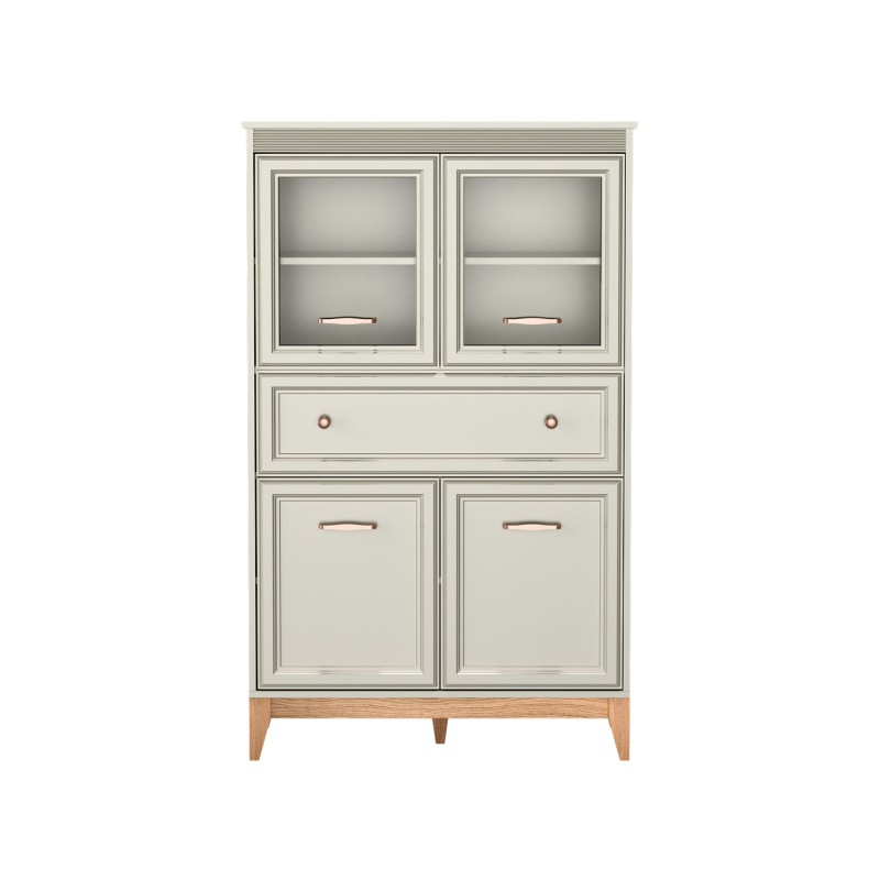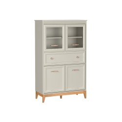 Stylowa witryna Charlott to połączenie elegancji i praktyczności. Przeszklone drzwi, półki, szuflada i dolne szafki oferują miejsce na ekspozycję i przechowywanie. Idealna do salonu, jadalni lub gabinetu.