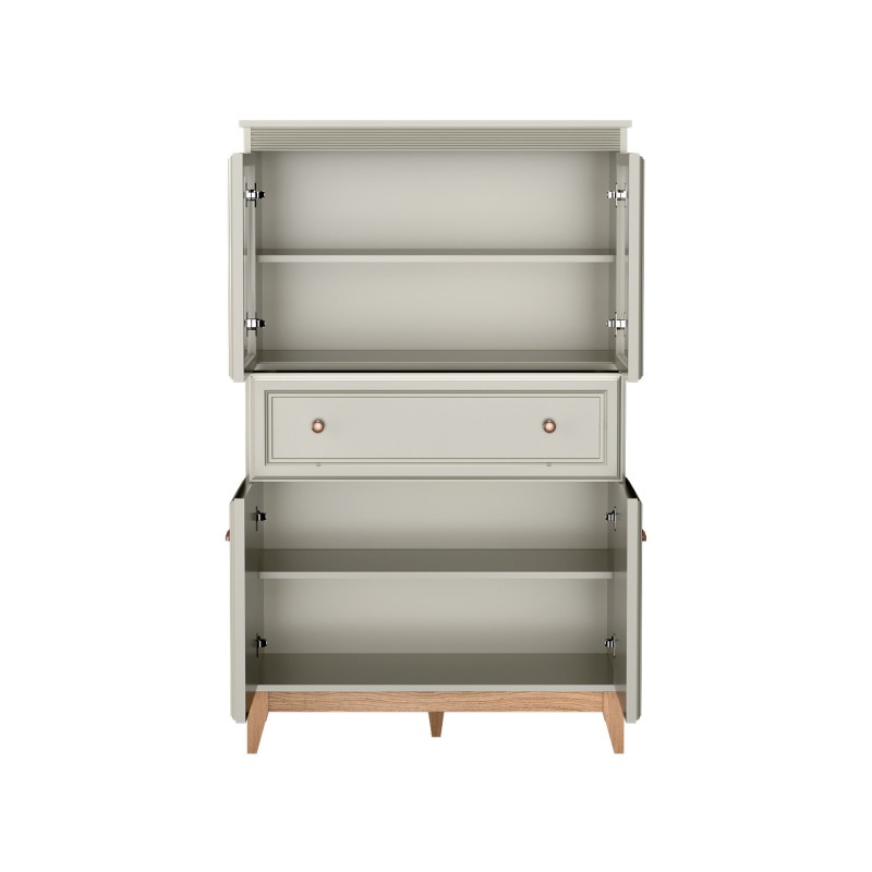 Witryna Charlott to mebel, który łączy ponadczasową estetykę z wysoką funkcjonalnością. Harmonijne połączenie koloru kaszmiru z naturalnym dekorem dębu nadaje wnętrzu przytulności i klasy. Idealna do salonu, jadalni, gabinetu czy nawet eleganckiego korytarza.