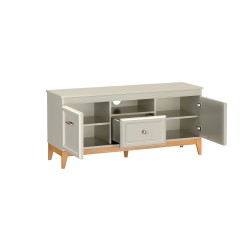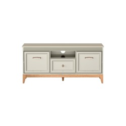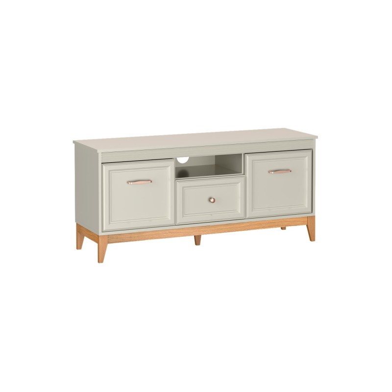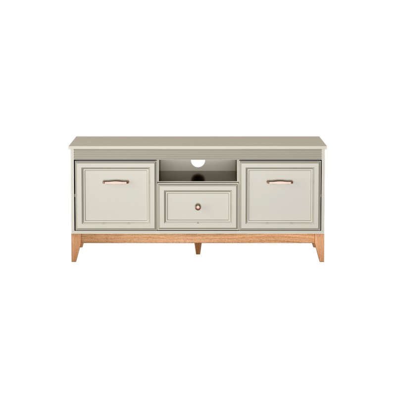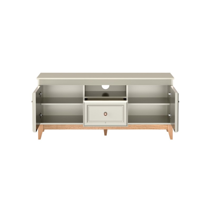 Szafka RTV Charlott 135 cm to idealne połączenie klasycznego wzornictwa z nowoczesną funkcjonalnością. Jej subtelna kolorystyka w odcieniu kaszmiru, wzbogacona o drewniane detale, wprowadza do wnętrza ciepło i harmonię. Proporcjonalna, niska bryła o szerokości 135,5 cm doskonale wpisuje się zarówno w tradycyjne, jak i nowoczesne aranżacje salonu.