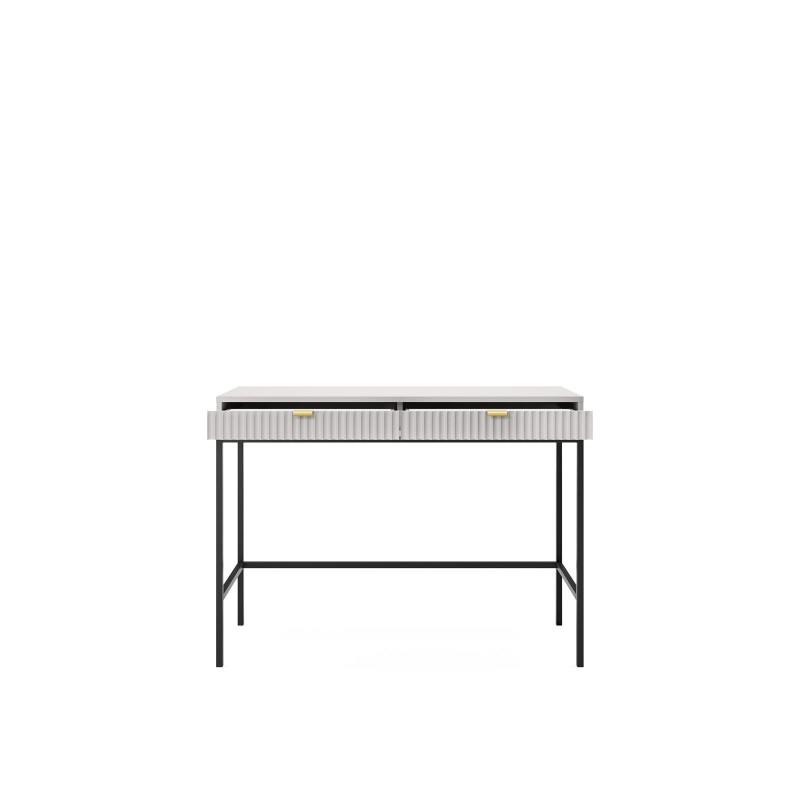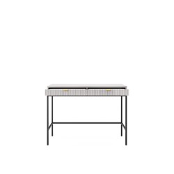 Biurko do makijażu Novia wyróżnia się szafką z płyty laminowanej o grubości 16 mm, która jest odporna na uszkodzenia. Fronty wykonane z płyty MDF o grubości 18 mm dodają trwałości i elegancji, a obrzeża ABS zapewniają dodatkowe zabezpieczenie krawędzi. Uroku dodają żebrowane fronty oraz uchwyty z aluminium w kolorze złotym, które podkreślają nowoczesny styl mebla.